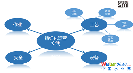 上面四個(gè)方面,每一個(gè)都值得深入探討,但今天時(shí)間有限,下面我將結(jié)合污水處理運(yùn)營(yíng)實(shí)際情況,從工藝精細(xì)化,設(shè)備精細(xì)化,安全精細(xì)化和作業(yè)精細(xì)化這四個(gè)方面談?wù)勎覀兊木?xì)化運(yùn)營(yíng)實(shí)踐。