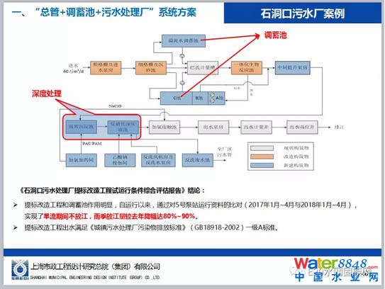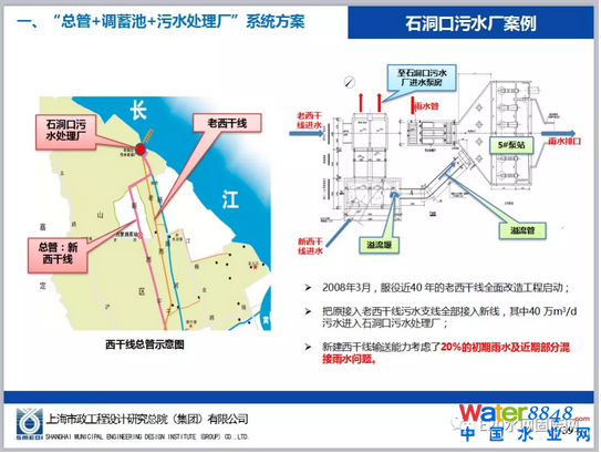 接著,張辰繼續(xù)介紹石洞口污水處理廠改造案例。2008年3月,服役近40 年的老西干線全面改造工程啟動,把原接入老西干線污水支線全部接入新線,其中40 萬m3/d污水進(jìn)入石洞口污水處理廠,因此新建西干線輸送能力就要考慮20%的初期雨水及近期部分混接雨水問題。