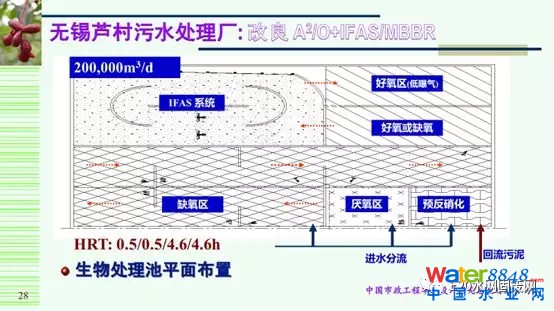 無錫蘆村污水處理廠是華北市政總院設(shè)計(jì)的我國(guó)首座采用一級(jí)A標(biāo)準(zhǔn)的污水廠。鄭興燦介紹,作為首座采用一級(jí)A標(biāo)準(zhǔn)的改造工程,蘆村污水處理廠采用了改良的A2/O+IFAS/MBBR。該廠最早使用的活性污泥法,后改造成A2/O,目前使用了改良A2/O+國(guó)內(nèi)首個(gè)大型IFAS/MBBR系統(tǒng),并設(shè)置了初沉發(fā)酵池。該廠不僅實(shí)現(xiàn)了冬季氨氮的達(dá)標(biāo),同時(shí),在碳源的投加下實(shí)現(xiàn)了總氮的達(dá)標(biāo)。至今,該工程已穩(wěn)定運(yùn)行10年,非常成功。