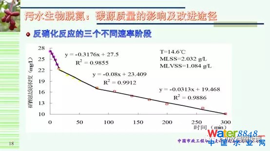 下圖為實(shí)際測(cè)定的反硝化反應(yīng)的三個(gè)不同速率階段,初始10分鐘左右去除6mg/L的硝酸鹽,之后60多分鐘再去除6mg/L,然后是緩慢的反硝化,約4個(gè)小時(shí)再去除6mg/L,可以看出,在很多工藝系統(tǒng)中,大部分時(shí)間反硝化速率處于很低的階段,有些設(shè)計(jì)人員認(rèn)為可以通過無限增加泥齡的方式來解決總氮去除率提升的問題,但實(shí)際上,缺氧端每增加1小時(shí)的停留時(shí)間,總氮的去除僅能增加1mg/L左右,考慮到硝化菌和反硝化菌之間的均衡,真正需要的時(shí)間可能是2小時(shí)。兩個(gè)小時(shí)的停留時(shí)間才增加1mg/L,從投資和運(yùn)行成本來講,還不如適當(dāng)?shù)耐都油獠刻荚,因(yàn)槊咳コ?mg/L左右的總氮,碳源費(fèi)用大概是0.1元。