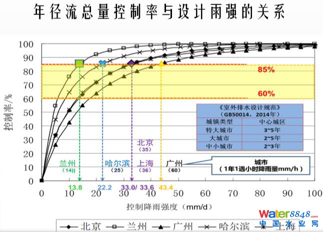 2015年國(guó)務(wù)院發(fā)布的《國(guó)務(wù)院辦公廳關(guān)于推進(jìn)海綿城市建設(shè)的指導(dǎo)意見(jiàn)》已經(jīng)明確指出通過(guò)海綿城市建設(shè),綜合采取“滲、滯、蓄、凈、用、排”等措施,最大限度地減少城市開(kāi)發(fā)建設(shè)對(duì)生態(tài)環(huán)境的影響,將70%的降雨就地消納和利用。其中,70%的降雨控制率是根據(jù)我國(guó)的水文本底狀況圖得出的,美國(guó)目前的降雨控制率為90%。這是大概率、小降雨的累積量,我們的目的就是要“潤(rùn)物細(xì)無(wú)聲”的把水留下來(lái)。