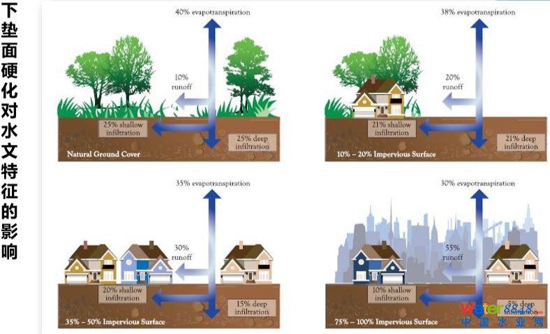 下墊面硬化是城市建設(shè)過(guò)程中所面臨的最大的問(wèn)題之一。硬化會(huì)破壞城市水系統(tǒng)的循環(huán),下圖表示不同硬化條件下,當(dāng)?shù)厮奶卣鞯淖兓闆r。從圖中可以看到隨著城市化的加深,不透水下墊面所占的比例越來(lái)越大,嚴(yán)重影響了當(dāng)?shù)氐乃h(huán)過(guò)程。造成的直接影響是地表徑流顯著增大,而滲透的地下水逐漸減少。隨之引發(fā)的是一系列的生態(tài)、環(huán)境、資源和安全問(wèn)題等。從海綿效應(yīng)的角度來(lái)看,這是由于當(dāng)?shù)刈匀画h(huán)境本身所固有的海綿效應(yīng)在人為建設(shè)過(guò)程受到干擾,因此失效了。