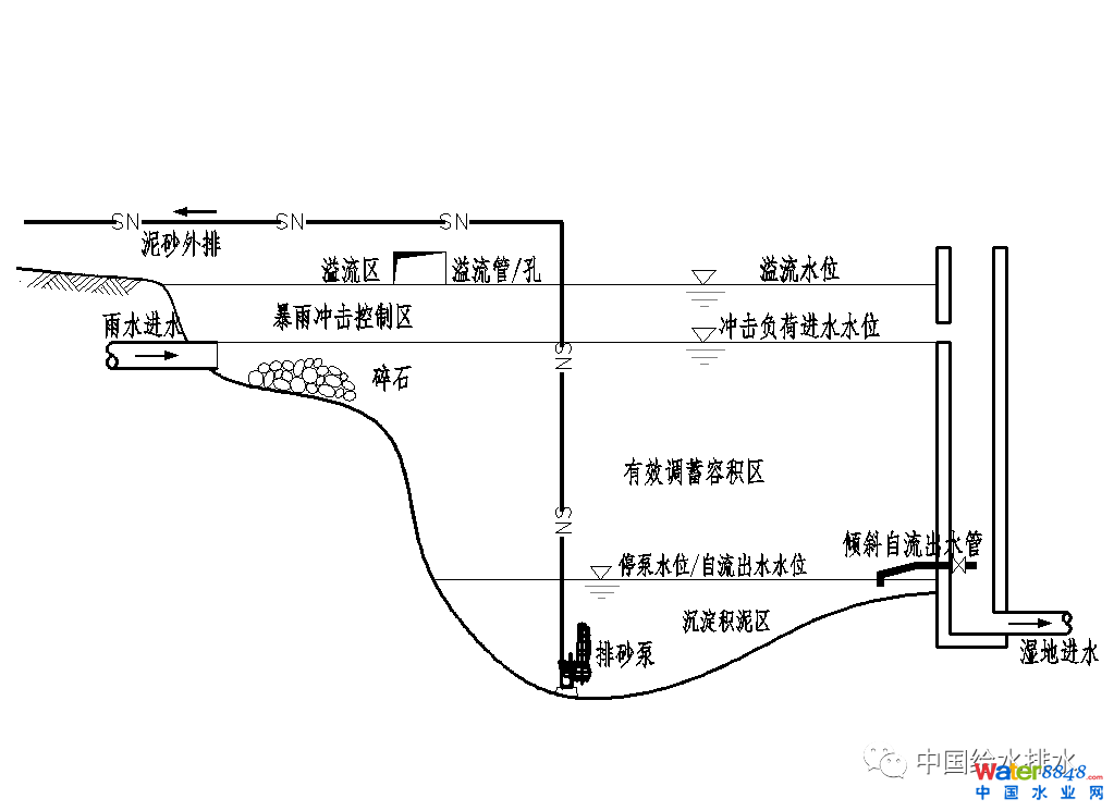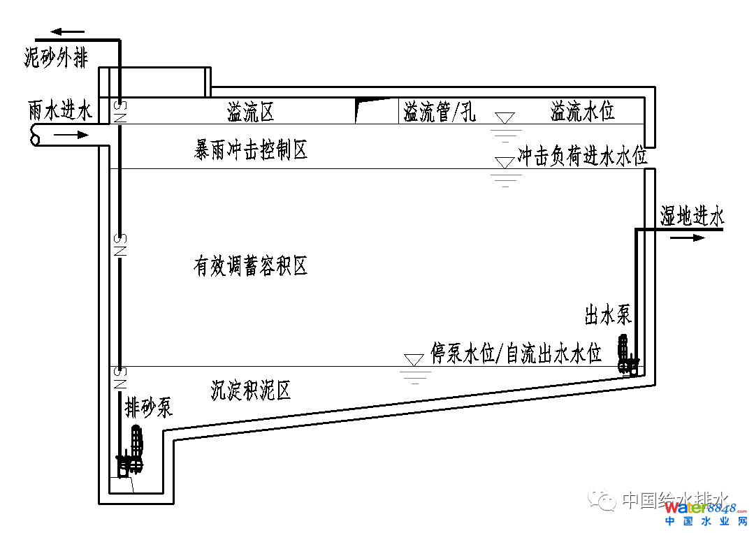 前置調(diào)蓄池或前置塘(forbay)的功能除了雨量貯存調(diào)節(jié)外,通常還擔(dān)負(fù)著預(yù)處理、濕地沖擊負(fù)荷調(diào)節(jié)以及暴雨溢流等任務(wù)。根據(jù)出水方式,前置調(diào)蓄池/塘出水流量通常分為泵控制和管徑控制兩種類型。當(dāng)人工濕地建設(shè)用地地勢較平坦,雨水管接入埋深較大,可將前置調(diào)蓄池設(shè)計為地埋式以節(jié)省人工濕地占地面積,出水流量采用泵控制方式,如圖3(a),這時人工濕地的日常負(fù)荷進水量Q晴由水泵從調(diào)蓄池中泵入;當(dāng)人工濕地建設(shè)用地落差較大,雨水管接入標(biāo)高足夠,則優(yōu)先選用無能耗的管徑控制進水負(fù)荷方式,由前置調(diào)蓄池的日常出水管重力自流出水接入人工濕地,進水水量由出水管管徑的過水能力以及調(diào)節(jié)池內(nèi)剩余有效水位確定,如圖3(b),此時的前置調(diào)蓄池通常設(shè)置為與濕地景觀相協(xié)調(diào)的地面開敞式前置塘。以上無論哪種進水方式,雨水人工濕地前置調(diào)蓄池的容積分區(qū)由上而下一般由四部分構(gòu)成:沉淀集泥區(qū)、有效調(diào)蓄容積區(qū)、暴雨沖擊控制區(qū)和溢流區(qū)。各容積的分區(qū)水位分別為停泵水位/自流出水水位、沖擊負(fù)荷進水水位和溢流水位,如圖3所示。