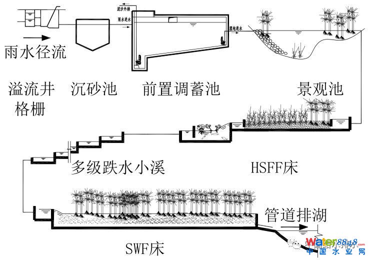 棕櫚泉人工濕地具體流程見圖4,采用濕地塘床組合工藝,主要包括沉砂池、前置調(diào)蓄池、景觀池、潛流(HSSF)床、多級跌水小溪、表流(SWF床)等。