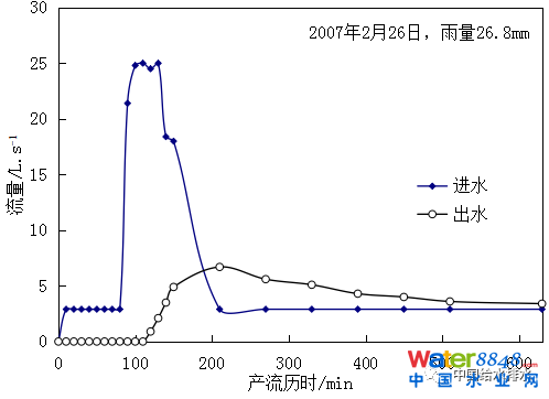 圖1 棕櫚泉人工濕地單場降雨實測進出水流量過程