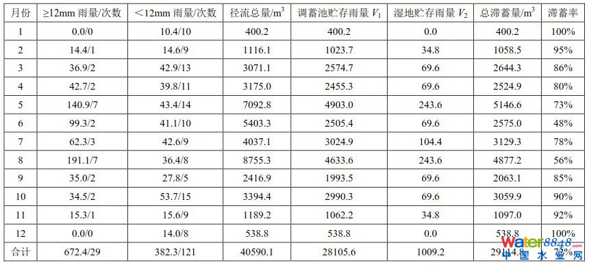 2012年對棕櫚泉雨水人工濕地匯水區(qū)降雨情況進行了全年監(jiān)測。該年總降雨量1054.7mm,降雨天數(shù)150d,年地表徑流總量為40590 m3。其中各月降雨情況及人工濕地系統(tǒng)的雨水滯蓄量計算見表3。
