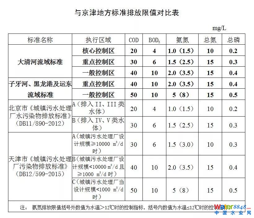 子牙河、黑龍港及運(yùn)東兩個流域重點(diǎn)控制區(qū)和一般控制區(qū)污染物排放限值分別為V類和現(xiàn)行城鎮(zhèn)污水處理廠一級A標(biāo)準(zhǔn)。和天津城鎮(zhèn)污水處理廠排放限值來比較,我省地方標(biāo)準(zhǔn)和天津地標(biāo)基本相當(dāng)。