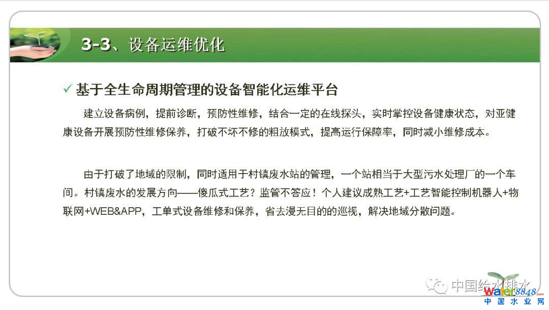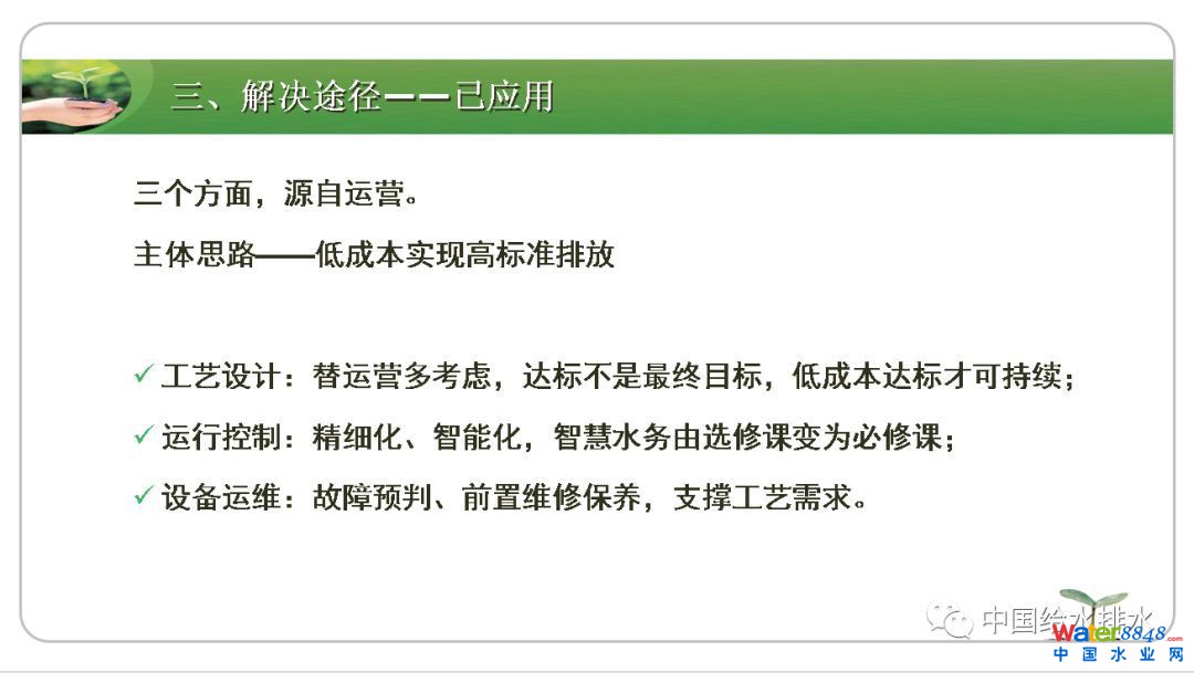 第3大點分享一下我們創(chuàng)業(yè)環(huán)保在面對以上問題的解決方案,主要有3個方面,都源自運營,主體思路是以低成本實現(xiàn)高標準排放,3個方面分別是工藝設(shè)計優(yōu)化,運行控制優(yōu)化和設(shè)備運維優(yōu)化。工藝設(shè)計要求工藝不僅僅以可能達標為目的,同時還要考慮達到這一目的的成本,運行控制要更多的采用精細化和智能化的控制手段,那么智慧水務(wù)由選修課變成了必修課,設(shè)備運維方面要能夠?qū)υO(shè)備故障進行預(yù)判,前置維修保養(yǎng),支撐工藝需求。