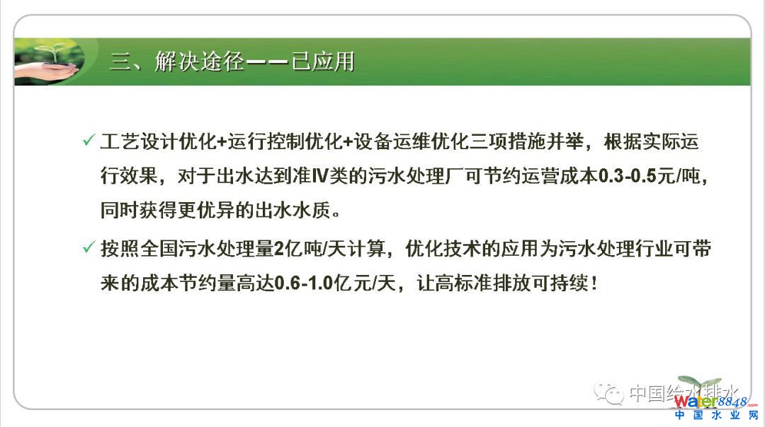 這些優(yōu)化措施同時作用,在達到準四類標準的情況下,總計可節(jié)約噸水0.3-0.5元的成本,如果這些技術(shù)應(yīng)用到全國的污水處理廠,按照每天2億噸污水計算,每天節(jié)約的成本量將達到0.6-1億元,成本節(jié)約量將非?捎^。只有做到低成本達標高標準排放才可持續(xù),我們的提標改造研討會現(xiàn)在開到了第二屆,還能不能開第三屆第四屆甚至更多界,就要依托更多的技術(shù)創(chuàng)新來實現(xiàn)低成本高標準排放的目標,才能繼續(xù)開下去。