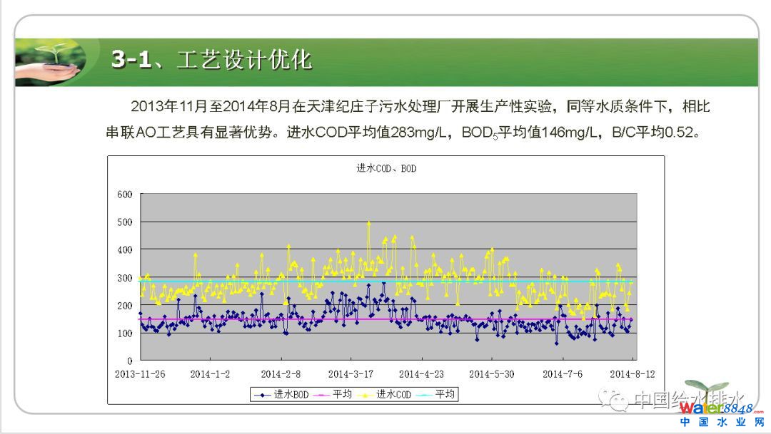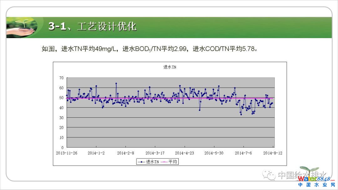 該工藝在紀莊子污水處理廠一個12萬噸每天的系列做進行生產(chǎn)性實驗效果也非常顯著,這是進水COD,BOD和TN的數(shù)據(jù),可以看出B/C為0.5以上,B/N為2.99,C/N為5.78,TN平均49,屬于典型的生活水水質(zhì).