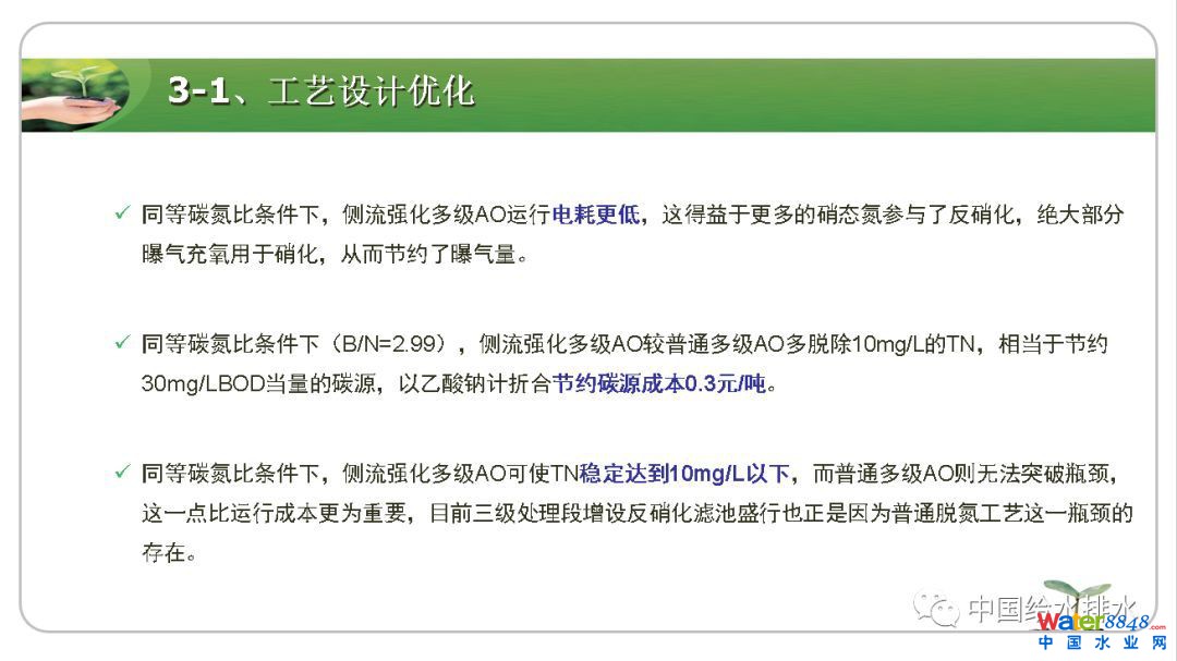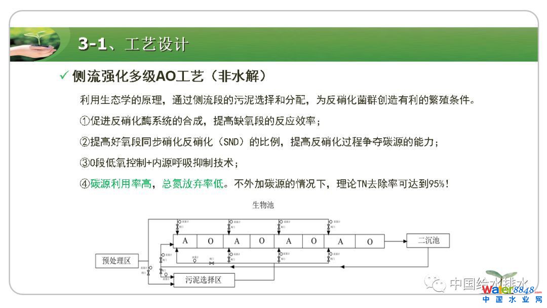 先講一下我們在工藝設(shè)計方面的改進,采用了側(cè)流強化多級AO工藝,這個側(cè)流并非水解,而是利用生態(tài)學(xué)原理,通過側(cè)流強化提高反硝化菌群的生長繁殖,提高其種群密度,并利用好氧、缺氧交替的環(huán)境,以及O段的低氧和內(nèi)源呼吸抑制技術(shù),促進反硝化酶系統(tǒng)的合成,提高反硝化速率。反硝化速率的提高一方面提高了缺氧段的反應(yīng)效率,另一方面提高了好氧區(qū)發(fā)生同步硝化反硝化的比例,這里可以看出來SND不是不可用,而是要用對地方,該有的缺氧區(qū)還要有,這一工藝,碳源利用率高,同時總氮放棄率低,在不外加碳源的情況下,一般碳氮比條件下,理論TN去除率可以達到95%。