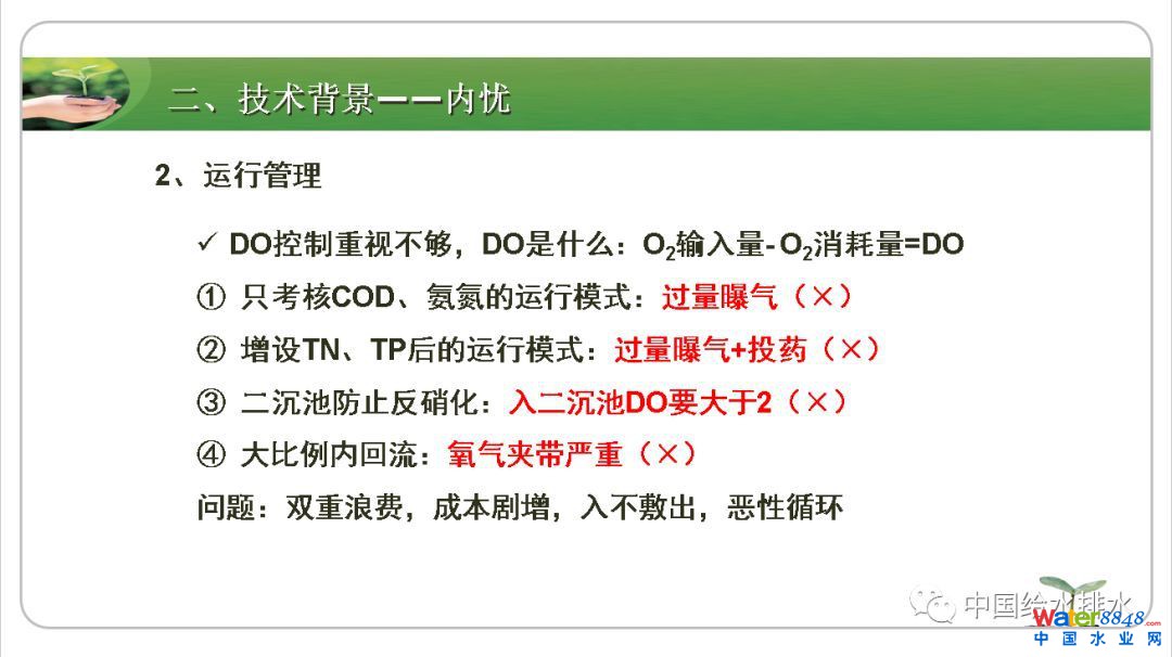 2、運行管理的內(nèi)憂:我們目前雖然做了很多的工作,但是目前從各方面來看,對于溶解氧控制的重視程度還是不夠的,只考核COD、氨氮的運行模式:過量曝氣。成本高一些。增加總氮、總磷之后的運行模式:過量曝氣+投藥的方式。第三就是二沉池防止反硝化:反硝化需要什么條件,反硝化第一需要沒有氧,第二,需要有微生物,第三,需要碳源,第四,需要有硝態(tài)氮,二沉池具備幾個條件?可以說,二沉池目前在生物池末端的BOD都已經(jīng)要求小于6了,實際可能也就2,3個,二沉池已經(jīng)不具有碳源的條件,如果二沉池想發(fā)生反應(yīng)的話,它的碳源需要污泥水解實現(xiàn),但二沉池的污泥停留時間顯然是不夠水解需求的,所以這里要說一個情況,我們可以完全不用擔(dān)心二沉池發(fā)生反硝化反應(yīng),現(xiàn)在我們是地表四類、地表三類了,完全不用擔(dān)心這個問題,執(zhí)行二級標準的時候大家擔(dān)心是對的,新形勢下這種擔(dān)心是多余的。第四個就是大比例內(nèi)回流。氧氣夾帶很嚴重,浪費了碳源。