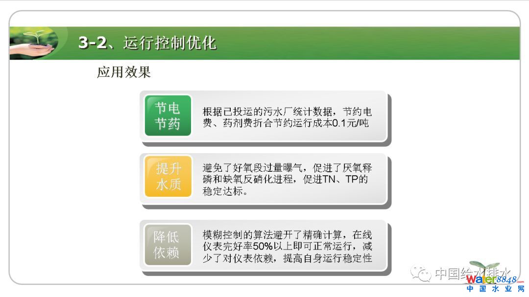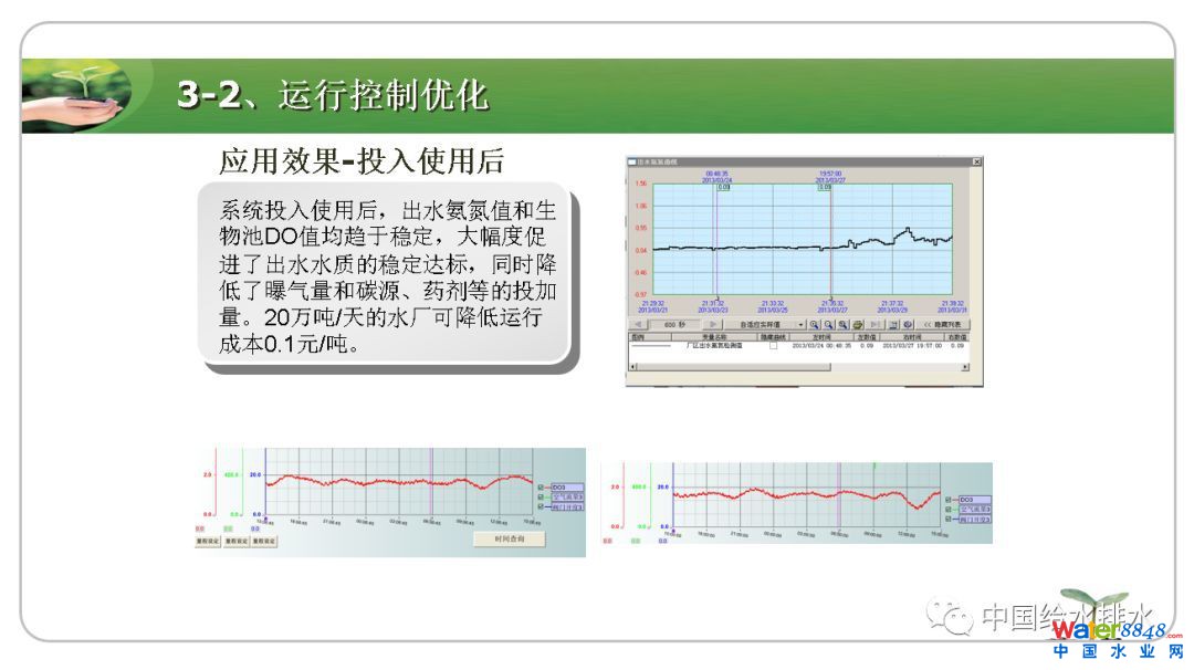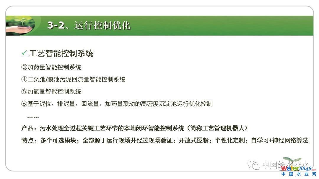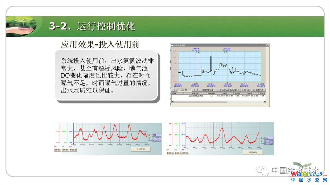 下面第二個優(yōu)化方向就是智慧水務(wù),我們所認為的智慧水務(wù)有三個階段,就像一個人,分為骨架,肉體和靈魂三個層次,骨架階段就是搭建基本的通訊通道,建立工業(yè)以太網(wǎng),實現(xiàn)數(shù)據(jù)采集和遠程開關(guān)控制,智慧水務(wù)的肉體就是現(xiàn)在比較火的大數(shù)據(jù)分析,數(shù)據(jù)模型分析以及基于專家診斷系統(tǒng)包括WEB端和移動APP監(jiān)控等,那么以上這些都只是把數(shù)據(jù)進行了采集和分析,這些數(shù)據(jù)究竟怎么樣才能為水質(zhì)達標和降低成本發(fā)揮作用呢,那就需要第三個層次,也就是我們說的靈魂階段,我們認為智慧水務(wù)的靈魂就是關(guān)鍵工藝環(huán)節(jié)的智能化控制,將人的控制策略交給機器來執(zhí)行,通過對有效數(shù)據(jù)的利用實現(xiàn)自動調(diào)整,達到節(jié)能和增效的作用,這才是智慧水務(wù)的落腳點和存在價值。