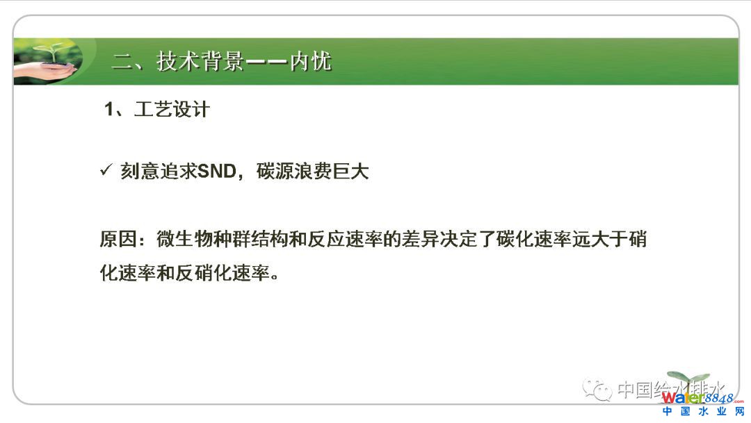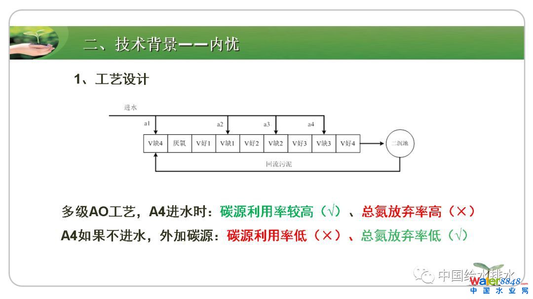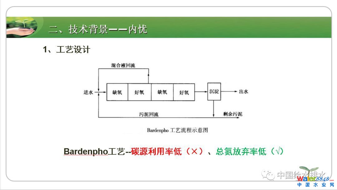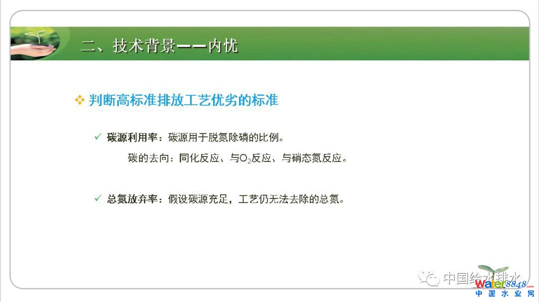 下面講一下技術(shù)背景,也就是內(nèi)憂。在說之前,先說兩個概念,一個叫碳源利用率,我在去年的時候也說過這個概念,碳源利用率就是碳源用于脫氮、除磷的比例,碳的去向大概有三個方向,同化反應(yīng)、與氧氣反應(yīng)、與硝態(tài)氮反應(yīng)。碳源與氧氣反應(yīng)或者同化反應(yīng),對于碳源來說都是不利的,雖然做不到100%與硝態(tài)氮反應(yīng),但是要追求盡量高比例的碳源,于硝態(tài)氮的反應(yīng)。另外一個叫總氮放棄率,總氮放棄率是什么概念呢,就是在假設(shè)碳源無限充足的情況下,我們得工藝仍然無法去除的總氮。