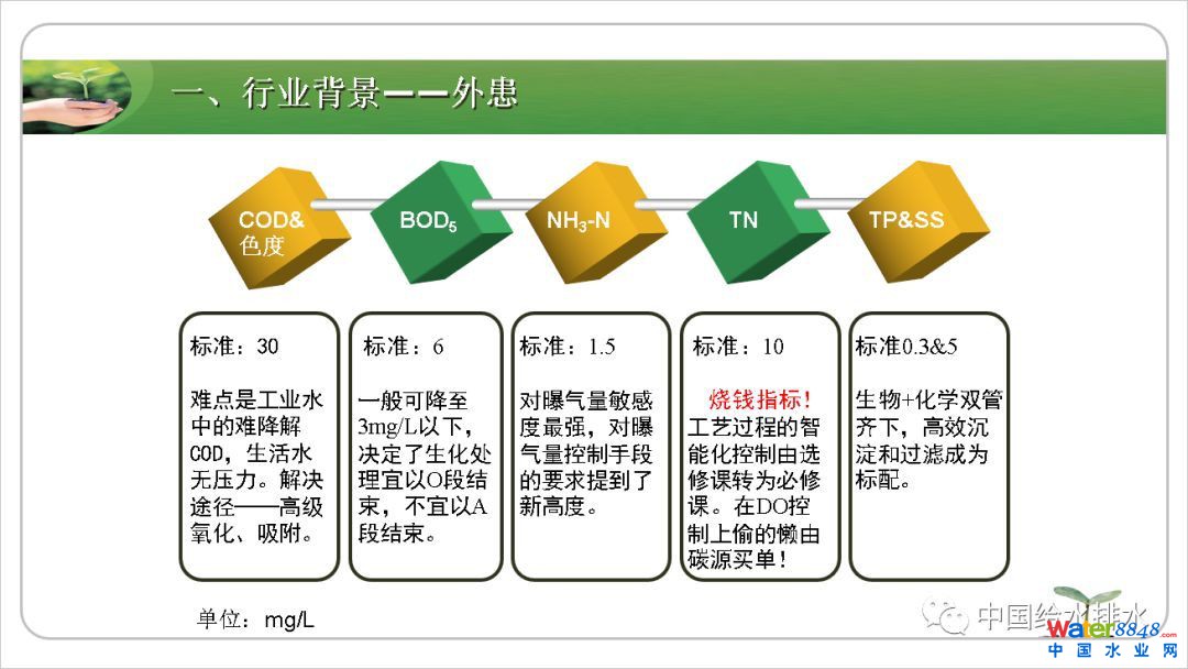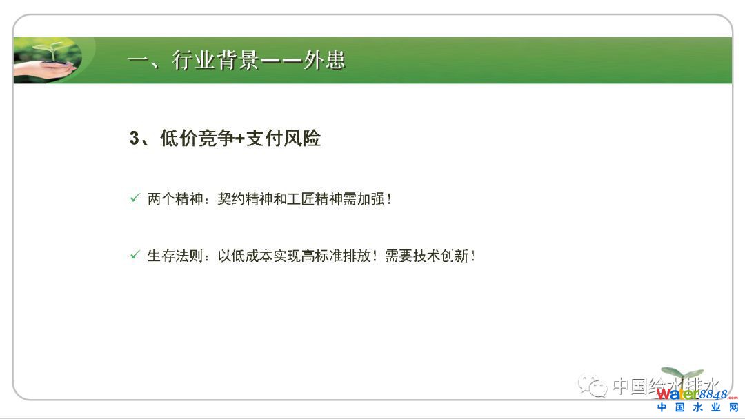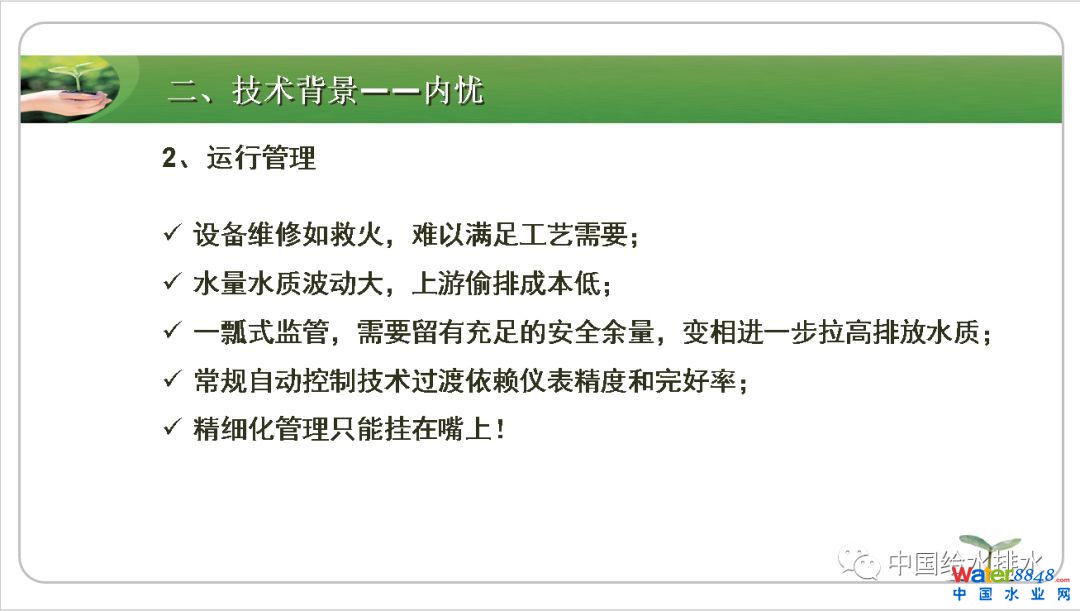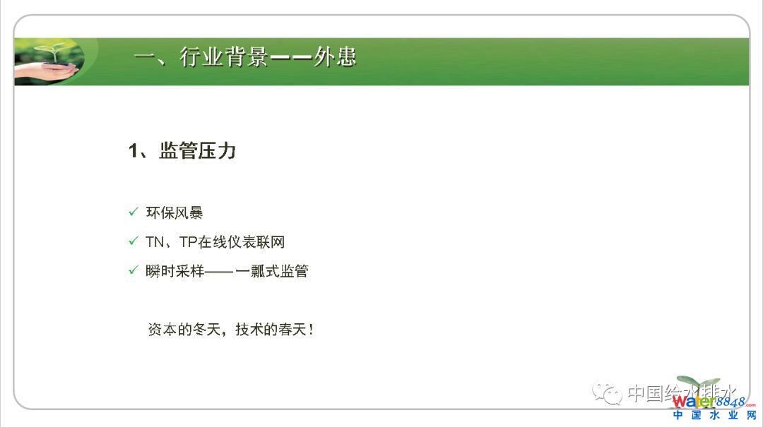 首先說一下行業(yè)背景,就是外患。外患第一點是監(jiān)管的壓力,大家知道近兩年來的“環(huán)保風(fēng)暴”,對于污水處理廠,包括整個環(huán)保行業(yè)的監(jiān)管壓力是空前的增加,新的《環(huán)保法》、“水十條”、按日計罰以及日趨嚴格的地方標準,壓力很大,另外一方面就是今年6月份要求污水廠加裝總氮、總磷的在線儀表,這種變化對于污水廠的運營影響還是比較大的,24小時的連續(xù)監(jiān)測對于精細化的控制要求提高了。再有一點就是環(huán)保的一瓢式監(jiān)管方式?傮w來說,在監(jiān)管壓力增加的情況下,幾乎是資本的冬天,但同時也帶來了機遇,監(jiān)管嚴了,正是促進技術(shù)進步的一個外在的動力。