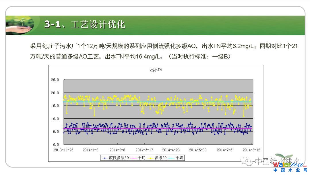 實驗同期對比另外一個21萬噸/天的普通多級AO工藝,通過九個月的對比發(fā)現(xiàn)在進水條件和管理人員完全一致的情況下,普通多級AO出水TN平均16.4,側(cè)流強化多級AO出水TN平均6.2。