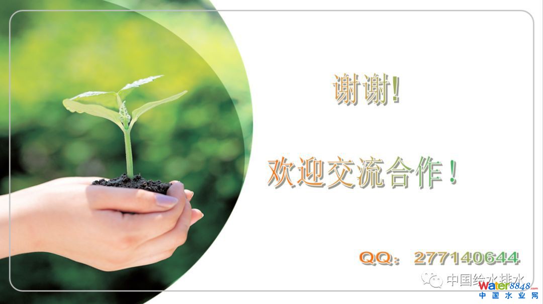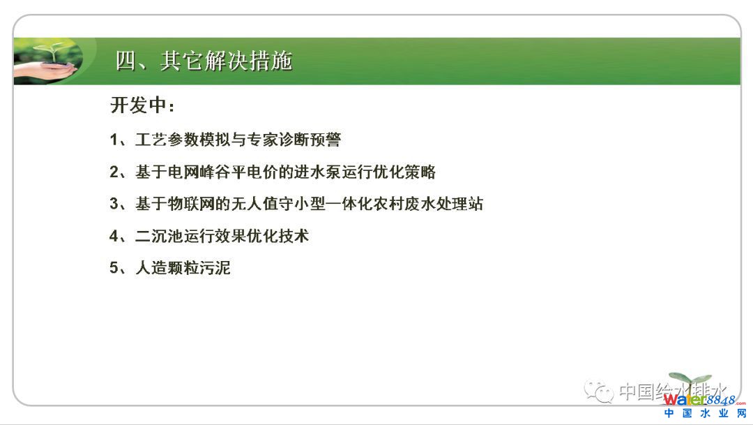 最后給大家分享一下我們還在研究的幾個方向,還沒有用到實際生產(chǎn)運行中,一是工藝參數(shù)模擬與專家診斷預(yù)警,二是基于電網(wǎng)峰谷平電價的進水泵優(yōu)化控制策略,三是基于物聯(lián)網(wǎng)的小型一體化農(nóng)村廢水處理站,四是二沉池運行效果優(yōu)化技術(shù),五是人造顆粒污泥。