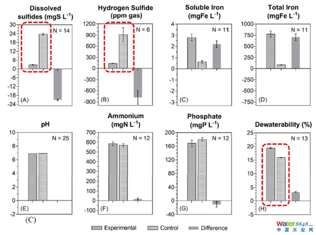 - 通過(guò)比較投加鐵鹽的實(shí)驗(yàn)系統(tǒng)中下水道出水的硫化物平均濃度為4.3±0.4 mgS/L,而對(duì)照系統(tǒng)中為8.2±0.4 mgS/L,可知向下水道中加入FeCl3可有效降低溶解的硫化物濃度。