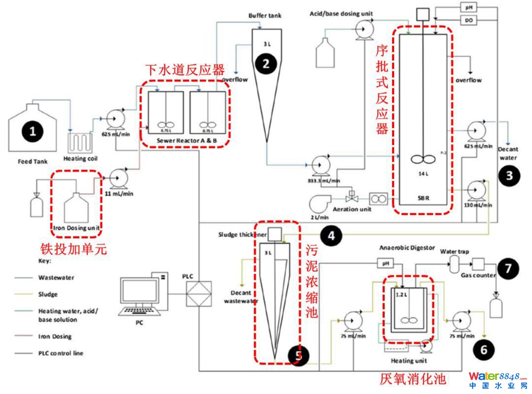 本研究旨在全面研究并評(píng)估下水道中投加的鐵鹽對(duì)城市污水排放與處理系統(tǒng)的總體影響效應(yīng),包括對(duì):(1)下水道中硫化物控制;(2)廢水處理過(guò)程中磷的去除;(3)厭氧消化池生產(chǎn)的沼氣中的H2S控制。實(shí)驗(yàn)室建立了兩個(gè)連續(xù)流的模擬城市污水系統(tǒng),包括下水道反應(yīng)器,用于生物去除有機(jī)碳和氮的序批式反應(yīng)器(SBR),污泥濃縮池和厭氧消化池(如圖1)。其中一個(gè)系統(tǒng)作為對(duì)照,另一個(gè)系統(tǒng)連續(xù)投加10mg/L的FeCl3作為實(shí)驗(yàn)系統(tǒng)。
