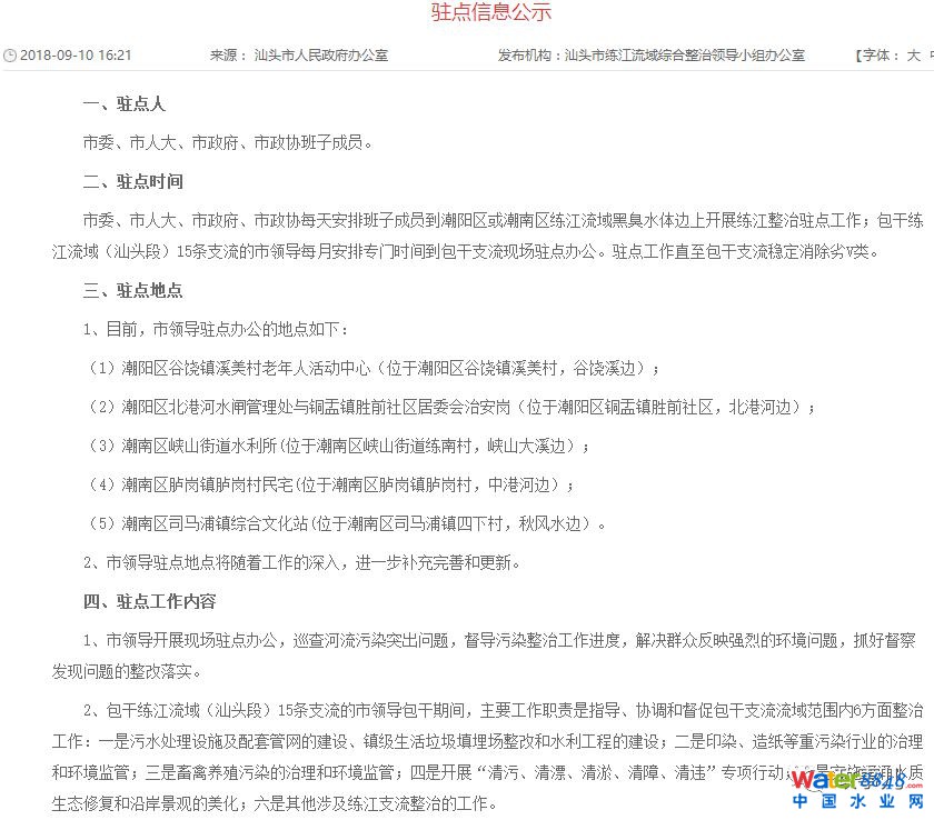 “政事兒”(微信ID:xjbzse)注意到,此番汕頭市練江流域綜合整治領(lǐng)導(dǎo)小組辦公室此番發(fā)布的駐點信息,明確駐點人為“市委、市人大、市政府、市政協(xié)班子成員”,“市委、市人大、市政府、市政協(xié)每天安排班子成員到潮陽區(qū)或潮南區(qū)練江流域黑臭水體邊上開展練江整治駐點工作”。