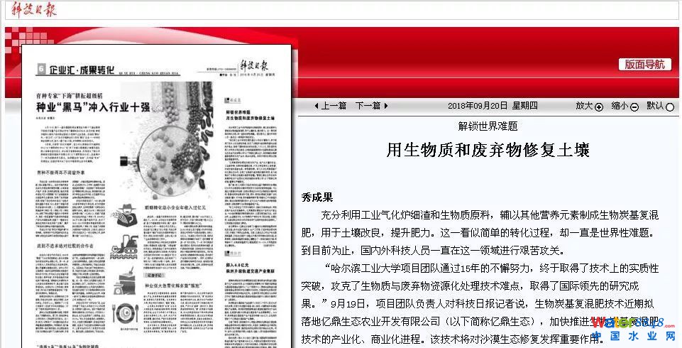 《科技日報(bào)》2018年9月20日(第6版:企業(yè)匯·成果轉(zhuǎn)化)刊發(fā)了題為“解鎖世界難題,用生物質(zhì)和廢棄物修復(fù)土壤”的報(bào)道。