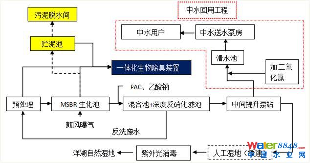 處理工藝創(chuàng)新,采用集生化反應(yīng)與泥水分離于一體、強化脫氮效果的五段式MSBR工藝作為二級生化工藝,采用微絮凝過濾代替?zhèn)鹘y(tǒng)的高效沉淀+過濾,并同時具有反硝化功能,處理工藝先進高效,投資省,運行成本低,并實現(xiàn)污水處理與再生利用的結(jié)合與統(tǒng)一。