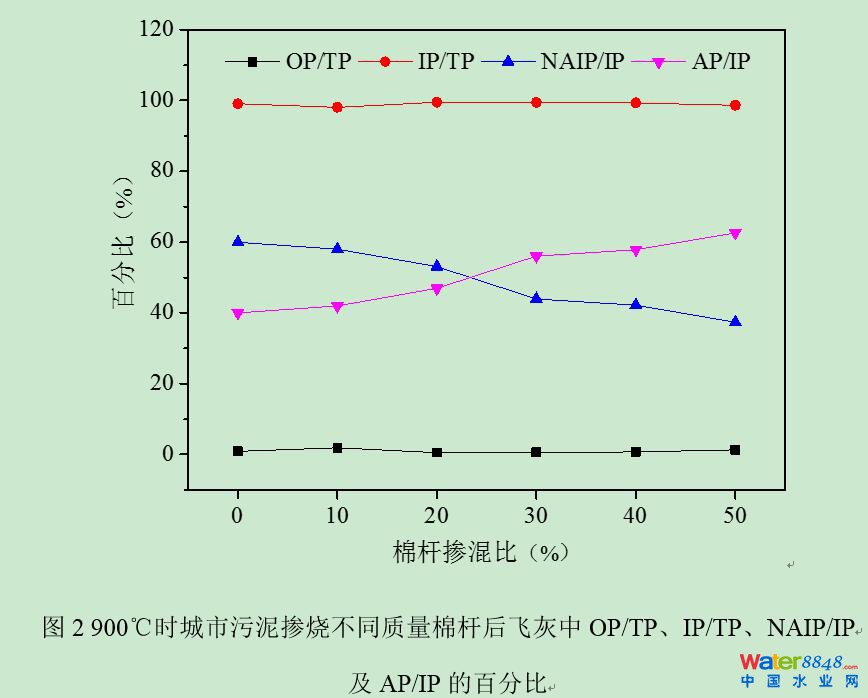 該研究的最終目標(biāo)是在降低污泥焚燒飛灰中重金屬毒性的同時,實現(xiàn)飛灰中磷資源的回收與利用。飛灰中磷的生物有效性是影響磷資源化利用的關(guān)鍵因素,而磷的賦存形態(tài)決定著磷的生物有效性。研究團隊系統(tǒng)研究了不同焚燒條件下,生物質(zhì)中礦物化合物對城市污泥及工業(yè)污泥焚燒中磷形態(tài)轉(zhuǎn)化及生物有效性的影響規(guī)律,證實了污泥焚燒過程中添加生物質(zhì),特別是棉桿,能有效促進污泥焚燒飛灰中非磷灰石無機磷(NAIP,F(xiàn)e/Al/Mn-P)向磷灰石無機磷(AP,Ca/Mg-P)轉(zhuǎn)化,提高了飛灰中磷的生物有效性,如圖2所示。同時,以AlPO4作為非磷灰石無機磷模型化合物,以CaO和KCl來模擬生物質(zhì)中的主要礦物質(zhì)成分,考察了