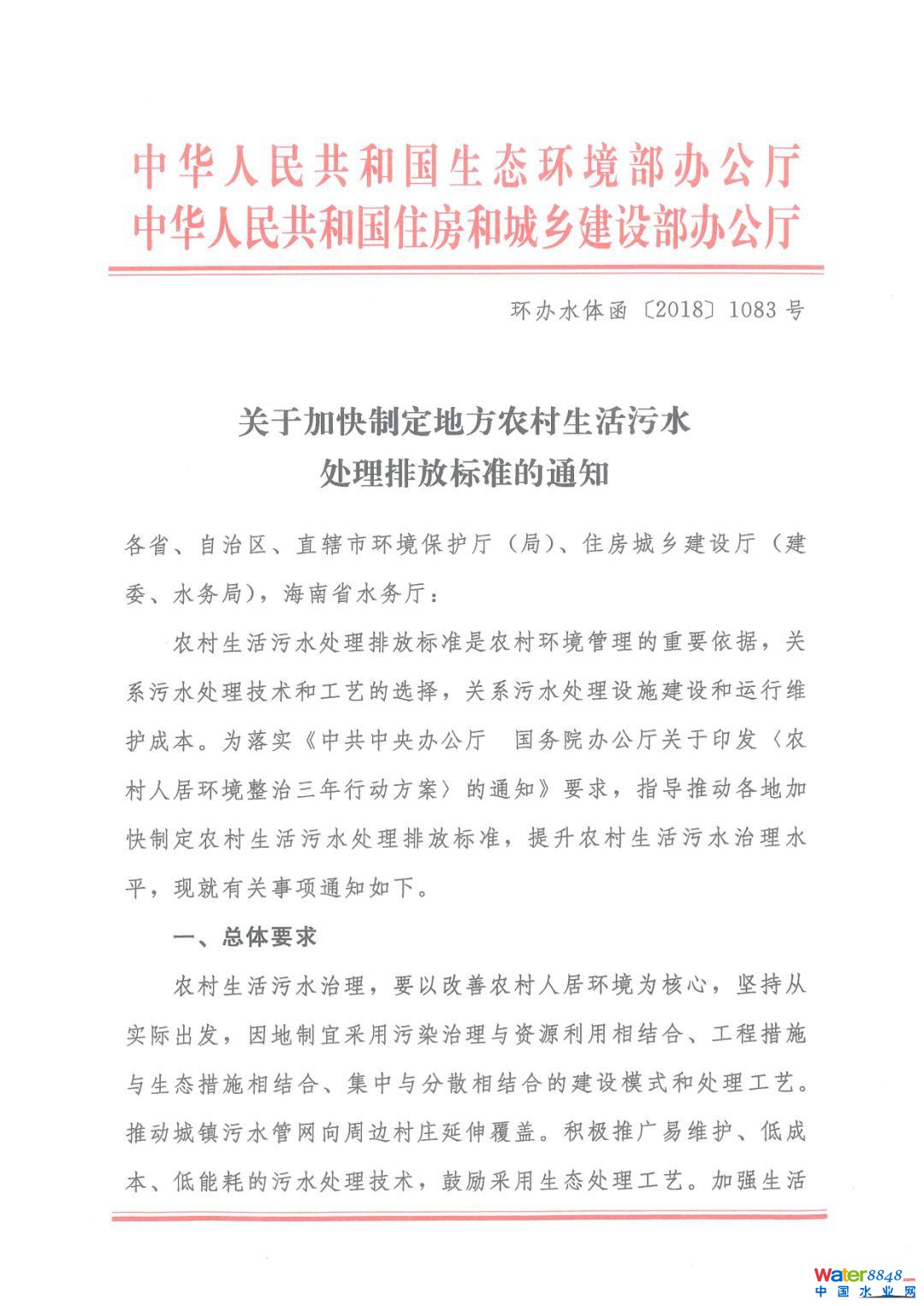 2018年9月29日,生態(tài)環(huán)境部、住房和城鄉(xiāng)建設(shè)部印發(fā)了《關(guān)于加快制定地方農(nóng)村生活污水處理排放標(biāo)準(zhǔn)的通知》,標(biāo)志著國家有了農(nóng)村生活污水處理排放要求,對指導(dǎo)推動各地加快制定農(nóng)村生活污水處理排放標(biāo)準(zhǔn),突破當(dāng)前農(nóng)村污水治理的瓶頸,具有劃時代、里程碑、歷史性的意義。