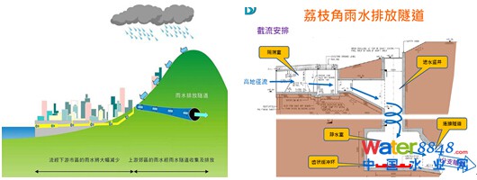 以位于九龍西北部的荔枝角雨水排水隧道為例,工程主要采用半山截流的方法,截取雨水,經(jīng)分支隧道流入靜水池,再經(jīng)主隧道排到海港,為荔枝角、深水埗、長(zhǎng)沙灣等下游區(qū)域提供了防洪保障。傳統(tǒng)的防洪方法是在市區(qū)拓建排水管道,而隧道截流是創(chuàng)新的防洪方法,它從源頭著手,建造雨水排放隧道,在半山截流雨水,再繞過(guò)稠密的下游市區(qū),直接排放入海。該工程于2008年至2012年建成。