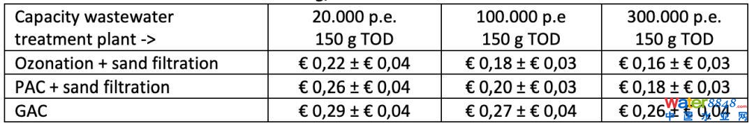 荷蘭的水應(yīng)用研究基金會STOWA、荷蘭水委會De Dommel,以及一個新興污染物的跨國行動項目組TAPES其實早在2015年就發(fā)表過一份技術(shù)報告,對三種工藝在不同處理規(guī)模項目進行成本評估,結(jié)果如下:
