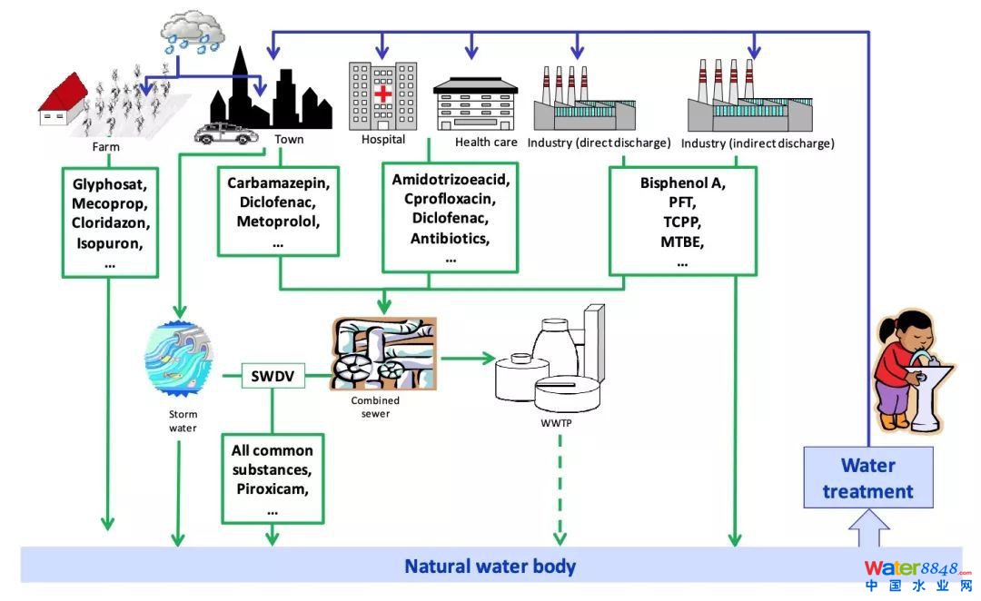 城市污水處理廠的設(shè)計最初是用來去除COD,后來增加了氮磷等營養(yǎng)物的去除要求。在過去10年,人們在污水廠里發(fā)現(xiàn)了不少以μg/L或pg/L計算的低濃度污染物。這些污染物受到越來越多的關(guān)注,人們一般稱之為微污染物(micropollutants)。