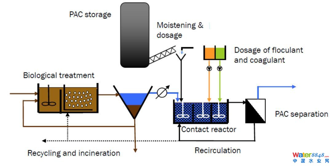 目前最常見的四級處理工藝包括了臭氧、粉末活性炭和顆粒活性炭。三種工藝的一般流程如下: