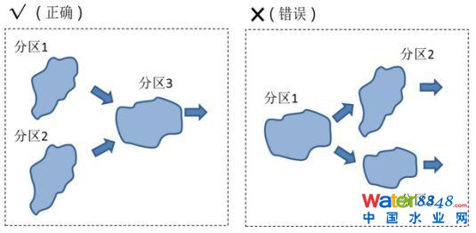 針對(duì)排水分區(qū)之間的連接性,首先應(yīng)校核不同分區(qū)之間是否相對(duì)獨(dú)立,相鄰分區(qū)間有無重疊或未覆蓋區(qū)域,并分析分區(qū)之間的連接路徑。不同分區(qū)可連接至下游同一分區(qū)(如圖4左),但某一排水分區(qū)不能同時(shí)連接至下游兩個(gè)排水分區(qū)(如圖4右)。通過上述分析,初步校核城市排水分區(qū)劃定的準(zhǔn)確性與合理性。其次,如前文4.3所述,不同重現(xiàn)期的降雨事件發(fā)生時(shí),排水分區(qū)之間可能會(huì)發(fā)生邊界的動(dòng)態(tài)變化,需要根據(jù)不同問題和設(shè)計(jì)降雨,針對(duì)對(duì)應(yīng)的排水分區(qū)進(jìn)行相應(yīng)分析。