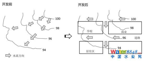 圖1 城市開發(fā)前與開發(fā)后地表水流過程示意