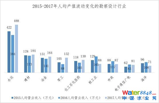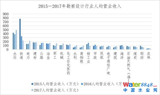 從勘察設(shè)計全行業(yè)來看,2015年、2016年和2017年營業(yè)收入分別為27089億元、33337億元和43391億元,年末從業(yè)人員分別為304萬人、320萬人和429萬人。通過計算得出勘察設(shè)計行業(yè)2015-2017年人均營業(yè)收入分別為89萬元、104萬元和101萬元。