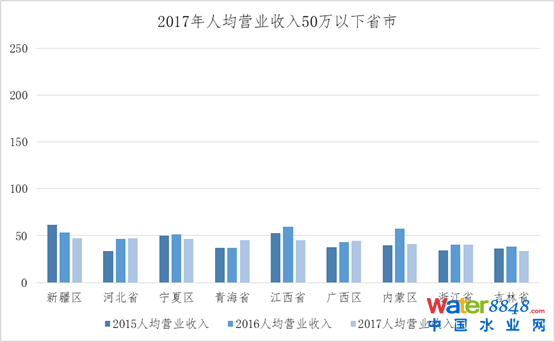 2017年人均營業(yè)收入水平50萬以下省市包括:新疆區(qū)、河北省、寧夏區(qū)、青海省、江西省、廣西區(qū)、內(nèi)蒙區(qū)、浙江省和吉林省。總體來看這些省市人均營業(yè)收入2015-2017年變化波動不大,其中青海省、廣西區(qū)人均營業(yè)收入增勢平穩(wěn),青海省人均營業(yè)收入由2015年37萬元增加到2017年45萬元,同期廣西區(qū)人均營業(yè)收入由34萬元增加到40萬元; 而新疆區(qū)人均營業(yè)收入水平下滑相對明顯,由2015年62萬元下降到2017年47萬元,2016年、2017年同比減少13%和11%。