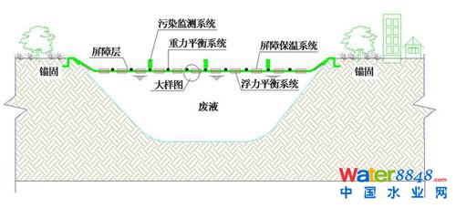 技術(shù)簡(jiǎn)介:采用柔性屏障(HDPE)制作的大型池體密封系統(tǒng),含柔性厭氧屏障、浮力墊、抗風(fēng)力配重、雨水收集導(dǎo)排、檢修、氣體收集等。該系統(tǒng)具有增強(qiáng)厭氧效果、防止雨水滲入、收集氣體、隨液位同時(shí)升降、維持壓力平衡的功能,是最佳的廢液與處理技術(shù)之一。