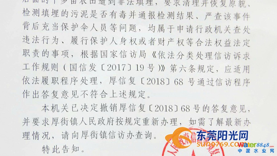 居民們到厚街信訪辦反映情況,去年12月初,厚街信訪辦回復(fù)了李先生,但李先生不滿厚街信訪辦的回復(fù),于是前往市信訪辦請(qǐng)求復(fù)查。去年12月24日,市信訪辦撤銷了厚街信訪辦的答復(fù)意見(jiàn)。目前,厚街信訪辦方面還沒(méi)有進(jìn)一步的處理。