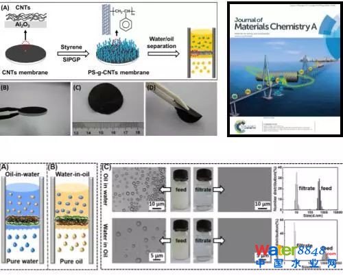 中科院寧波材料所高分子事業(yè)部陳濤研究員的智能高分子材料團隊長期致力于二維高分子納米復合油水分離材料的研究,通過表面接枝高分子刷和多級組裝技術,獲得多種新型復合材料,可實現高效分離油水乳液和凈化水質?蒲腥藛T采用多孔陶瓷作為襯底,抽濾納米碳管(CNTs)成膜,采用自引發(fā)的光接枝光聚合(self-initiated photografting and photopolymerization,SIPGP)的方法接枝疏水性的高分子聚苯乙烯(PS)到CNTs的表面,進而協同利用CNTs薄膜的高粗糙度表面,獲得超疏水性的二維雜化薄膜材料。該膜可用于微米和納米級油包水乳液的大通量、高效分離(J. Mater. Chem. A, 2014, 2, 15268-15272,圖1上,內封面)。在此基礎上,將得到的超疏水性的PS/CNTs薄膜反轉并轉移到另一個基底上,再次通過SIPGP將親水性的聚甲基丙烯酸二甲胺乙酯(PDMAEMA)單向接枝到CNTs膜的表面,從而得到具有親水/疏水結構的雙面(Janus)復合薄膜(PDMAEMA/CNTs/PS),實現對油包水和水包油乳液進行選擇性分離的效果(ACS Appl. Mater. Interfaces, 2014, 6, 16204,圖1下)。