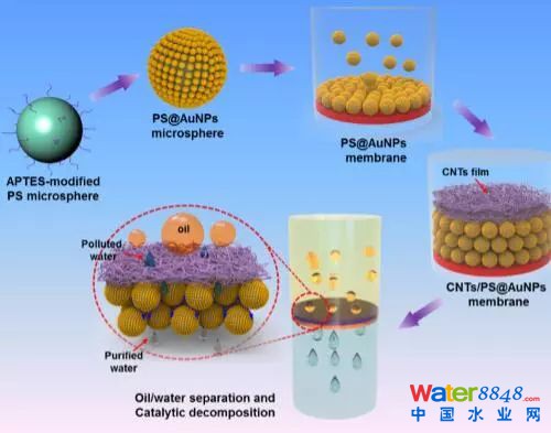 為快速有效去除油污水中的有害污染物,該團隊通過表面接枝分子刷和層層組裝技術,獲得一種新型多級復合材料,實現高效分離油水乳液和凈化水質。利用抽濾的方法,使得高密度負載金納米顆粒的聚苯乙烯復合微球(PS@AuNPs)緊密堆積,組裝形成復合微球催化薄膜,進而將親水性碳納米管薄膜沉積在微球薄膜表面,從而獲得一種水下超疏油、具有催化功能的多級復合薄膜(J. Mater. Chem. A, 2016, 4, 10810,圖2)。分離過程中,油相被上層碳管薄膜阻截,水相則通過微球間彎曲孔道穿過下層復合微球薄膜,從而實現油水分離功能。水相繞流經過微球孔道的同時,水相中模型有機污染物(硝基苯酚和硼氫化鈉混合溶液)與孔道內壁上的高密度金納米顆粒充分接觸,被快速催化分解,實現快速有效催化降解水中有機污染物。這種新型復合薄膜材料,首次同時實現了油水乳液分離和催化分解水溶性有機污染物,處理通量達到3500 L m-2 h-1 bar-1,催化效率最高可達92.6%,并具有良好的力學和催化穩(wěn)定性,可多次重復使用,并適于連續(xù)性操作,為工業(yè)化廢水處理提供了一種新的分離技術。當負載銀納米顆粒(Ag NPs)到超親水CNTs分離薄膜中,利用銀納米顆粒的殺菌性能,可在油水分離的同時殺死水質中的有機污染物或細菌,從而同時實現油水分離和快速有效凈化水質。