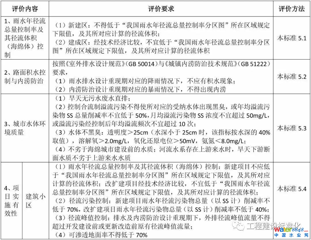 海綿城市建設效果從項目建設與實施的有效性、能否實現海綿效應等方面進行評價,具體評價內容及其評價要求見下表。“地下水埋深變化趨勢”、“城市熱島效應緩解”為考察內容,其他為考核內容。