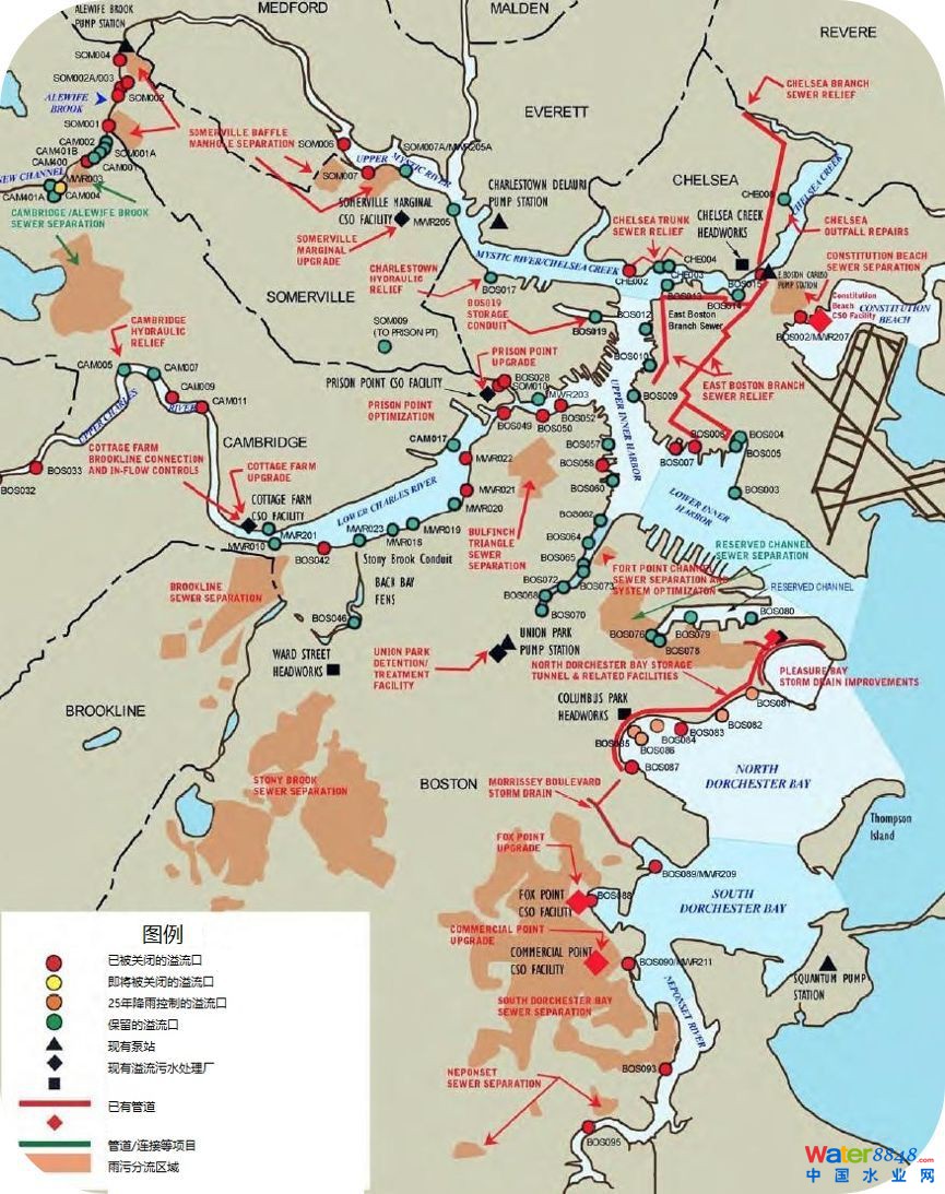 自1985年馬薩諸塞州水資源管理局成立以來,解決合流制溢流污水相關(guān)問題一直是當務(wù)之急。馬薩諸塞州水資源管理局于1994年制定了一項合流制溢流污水控制計劃。該計劃已經(jīng)通過環(huán)境審查,并獲得了聯(lián)邦和州政府的批準,作為波士頓港建設(shè)項目的重要部分,該項目按照聯(lián)邦法院規(guī)定的設(shè)計和施工計劃不斷推進。期間為降低成本并充分利用改良技術(shù),合流制溢流污水控制計劃經(jīng)歷了多次修訂。