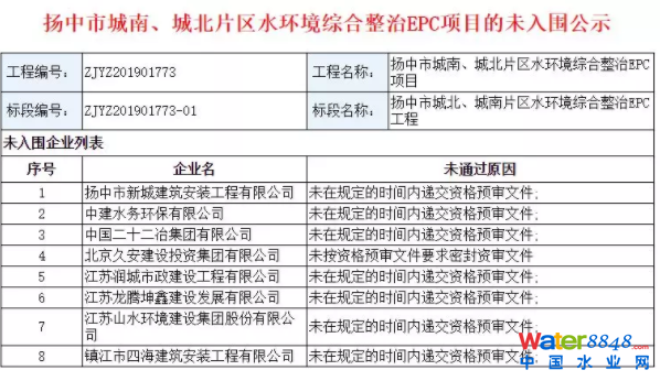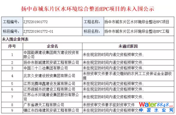中國(guó)水網(wǎng)獲悉,近日,揚(yáng)中市東片區(qū)水環(huán)境綜合整理EPC項(xiàng)目和揚(yáng)中市城南、城北片區(qū)水環(huán)境綜合整理EPC項(xiàng)目發(fā)布資格預(yù)審結(jié)果公告。有意思的是,資審結(jié)果顯示,不少企業(yè)因未按時(shí)遞交資深文件等理由未入圍。