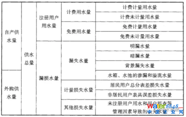 供水企業(yè)在探討漏損水量和漏失水量時,很容易混淆。其實,漏損水量(water losses)是指供水總量和注冊用戶用水量之間的差值。由漏失水量、計量損失水量和其他損失水量組成。漏失水量(real losses)是指各種類型的管線漏點、管網(wǎng)中水箱及水池等滲漏和溢流造成實際漏掉的水量。