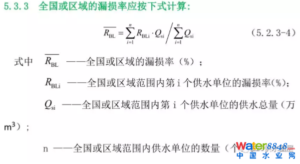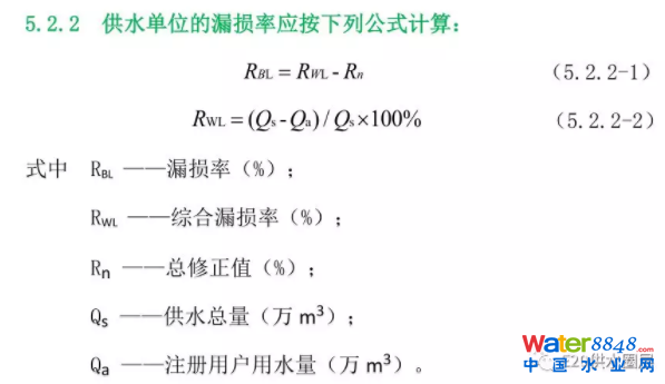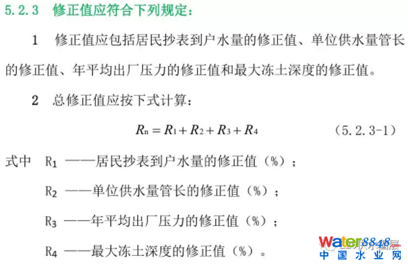 3、評定指標漏損率的計算更加明晰,新標準明確指出 漏損率=綜合漏損率—總修正值。總修正值依然包括原來的四項(居民抄表到戶水量修正值,單位供水量管長的修正值,年平均出廠壓力的修正值,最大凍土深度的修正值)。新增全國或區(qū)域的漏損率計算方式。