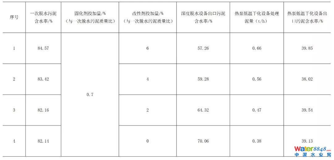 該聯(lián)用工藝投入運行后,根據(jù)改性后污泥耐壓性調(diào)整高壓帶式連續(xù)污泥深度脫水機的氣缸壓強(0.3-0.4MPa)、固化劑和改性劑投加量。熱泵低溫干化設(shè)備由于功率一定,根據(jù)能量守恒定律每小時出水量為定值,因此熱泵低溫干化設(shè)備出泥含水率由進泥含水率及進泥量決定。
