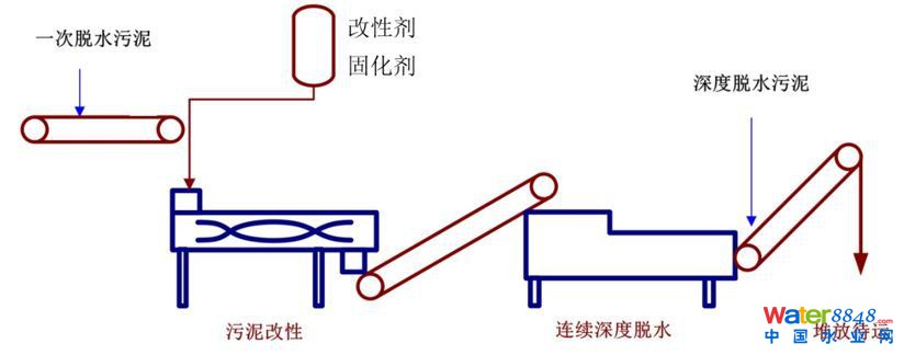 將一次脫水后的污泥(含水率80%左右)輸送至污泥改性混合機,同時投加污泥固化劑和改性劑。投加的上述藥劑和一次脫水后的污泥(含水率80%左右)在污泥改性混合機內(nèi)快速、均勻的混合。一方面,破解活性污泥結(jié)構(gòu),釋放結(jié)合水和胞內(nèi)水;另一方面,構(gòu)建微型骨架體增加污泥絮粒強度,提高脫水性能。