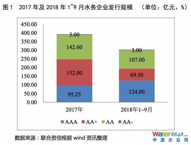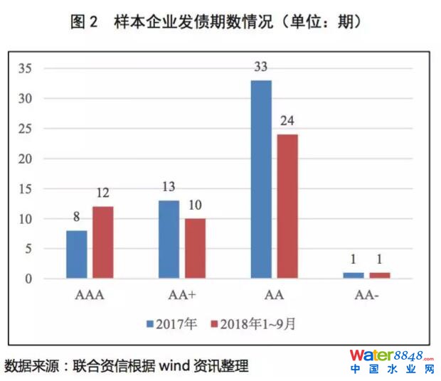 2018年1~9月,AAA級別水務企業(yè)發(fā)債期數占比最大,相當于總體發(fā)行期數的40.86%,共計發(fā)行12期,其中一季度2期、二季度4期、三季度6期;信用級別為AA級企業(yè)發(fā)債期數占比為35.26%,共計發(fā)行24期;信用級別為AA+企業(yè)發(fā)債期數占比為22.90%,共計發(fā)行10期。整體看,相較于其他級別,AAA級別水務企業(yè)融資方式較多,對金融環(huán)境強監(jiān)管、債券成本變化更敏感,特別是三季度以來市場資金面情況有所緩解,AAA主體級別水務企業(yè)發(fā)債期數有所增長。整體看,AAA主體級別水務企業(yè)發(fā)債期數較2017年有所上升。