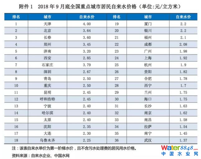 2018年1~9月,全國主要36個大中城市的自來水價和污水處理價格變動不大。自來水方面,石家莊和銀川上調了居民用水價格;居民生活用水(自來水)價格(第一階梯水價)平均為2.32元/立方米,較2017年的2.29元/立方米略有提升。