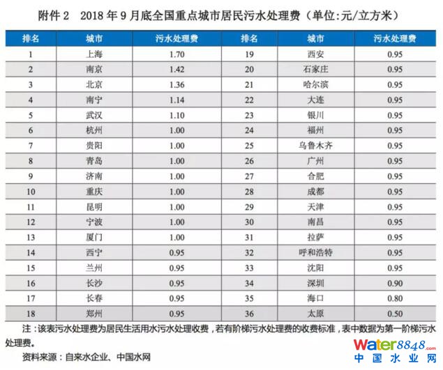 污水處理價格方面,根據國家發(fā)改委《關于制定和調整污水處理收費標準等有關問題的通知》(發(fā)改價格[2015]119號),污水處理收費標準要補償污水處理和污泥處置設施的運營成本并合理盈利,要求2016年底前,城市污水處理收費標準原則上每噸應調整至居民不低于0.95元,非居民不低于1.4元。2018年1~9月,全國36個大中城市中南昌市的污水處理價格調升,居民生活污水處理費排名后三位的城市包括深圳、?诤吞,價格處于0.50元~0.90元/立方米(見附表2)。